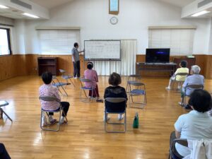 サロン活動紹介:川尻11町内サロン [2025-06-30] 今回は川尻11町内サロンにお邪魔してきました。 この日は約20名の参加者があり、内容は、脳トレと100歳体操で 頭と体を使う健康維持のためにぴったりの内容でした。 サロン運営者である中尾さんによる脳トレは、計算や四字熟語 文字を並び替えて正しい言葉を作るゲームなど 趣向を凝らした内容で、また学校の先生のような中尾さんの話術に 参加者は皆、熱心に聞き入っていました。 100歳体操も40分間みっちり取り組まれ、心地よい疲労感でした。 参加者の元気の源になっているようです。